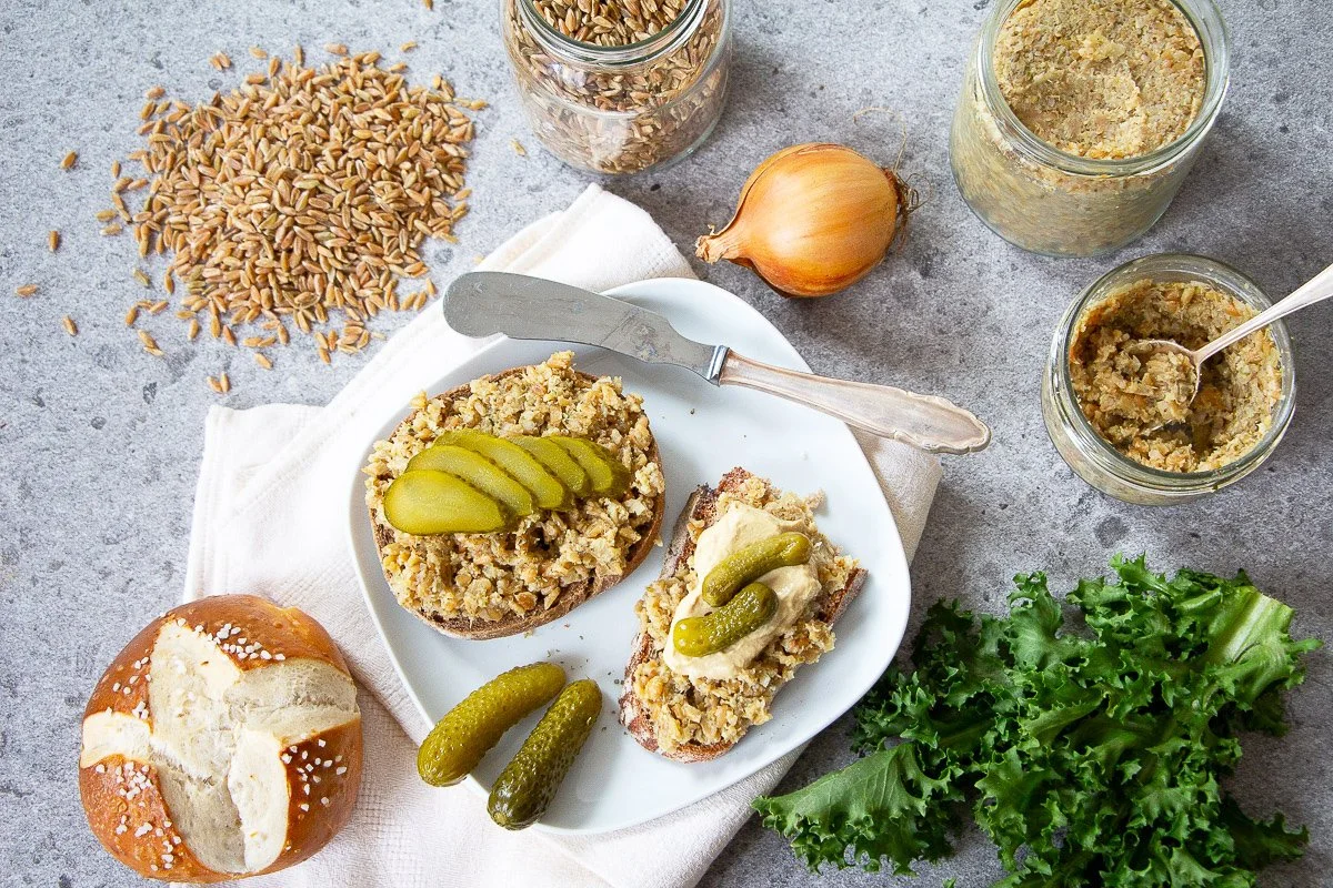 Lust, deine vegane Brotzeit etwas aufzupeppen? Dann ist dieses Rezept genau das Richtige für dich. Aus Grünkern entsteht ein veganer Aufstrich in Leberwurst-Optik – eine tolle sojafreie Alternative zur klassischen Leberwurst auf Basis von Bohnen und Räuchertofu.