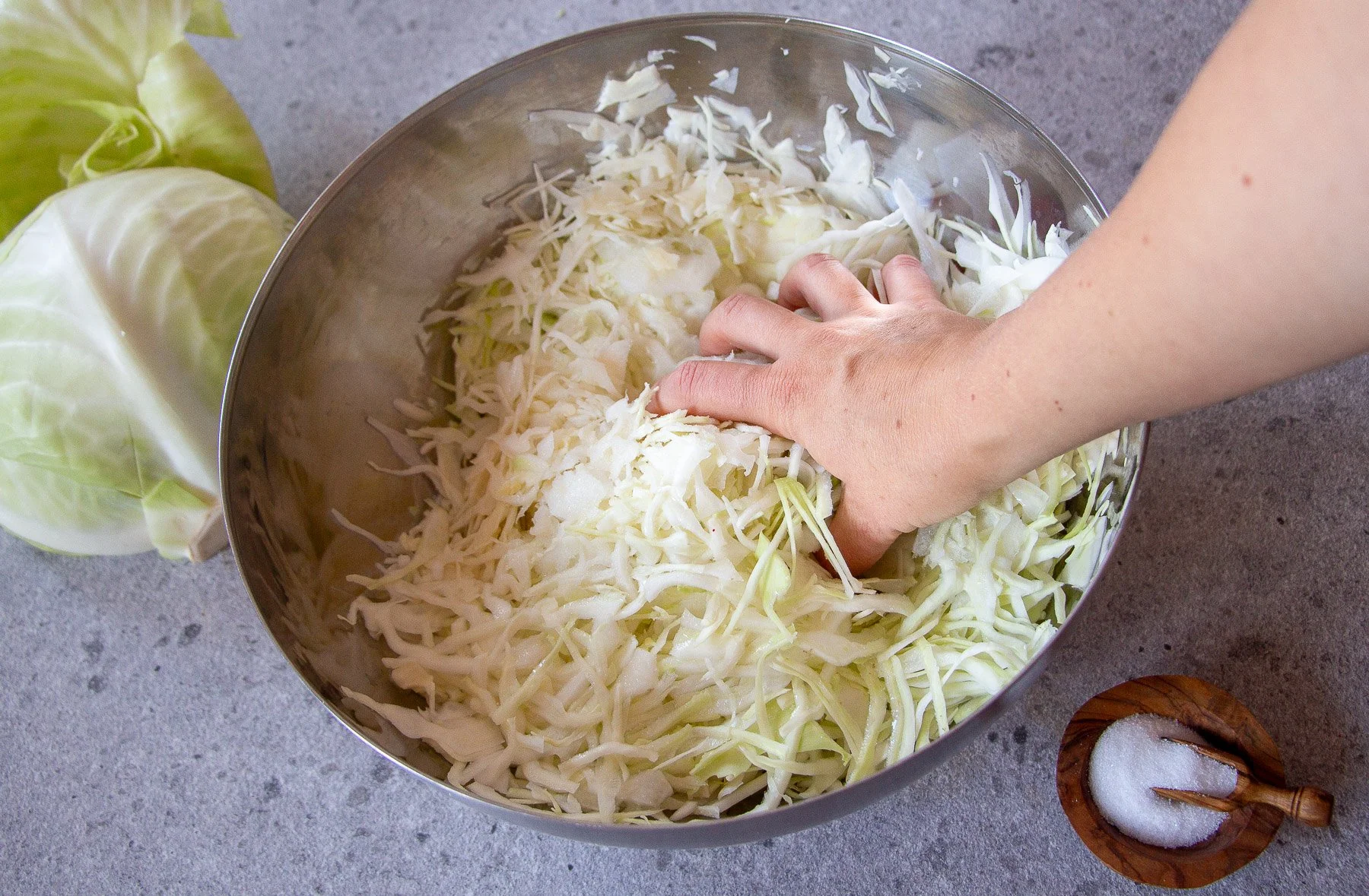 2. Auf 1kg Weißkohl 20g Steinsalz geben und mit den Händen alles in einer Schüssel kneten bis Flüssigkeit entsteht und das Sauerkraut eingeweicht ist. Dieser Prozess dauert in der Regel nicht länger als 5 Minuten.