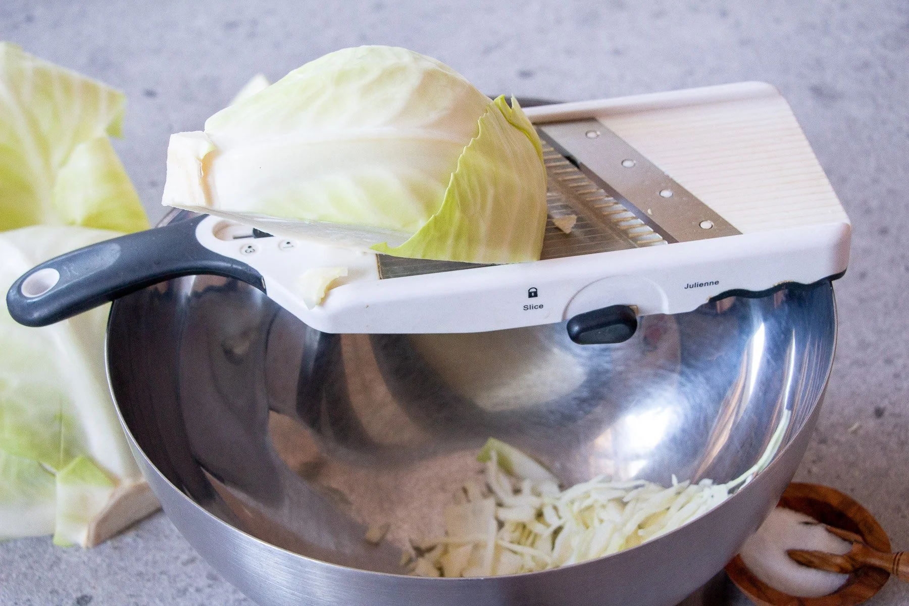 1. Zu Beginn Hände waschen. Entferne die äußeren, eventuell beschädigten Kohlblätter. Viertele den Kohlkopf und rasple die Viertel mit einem Gemüsehobel in dünne Streifen. Ein scharfes Messer eignet sich hierfür auch. Die Kohlstücke können beliebig groß sein. Mit einem feinen und messerscharfen Gemüsehobel entsteht blitzschnell Sauerkraut genau wie im Handel erhältlich. Je größer die Stücke, desto knackiger bleibt das Kraut. Je feiner es ist, desto saftiger wird es.