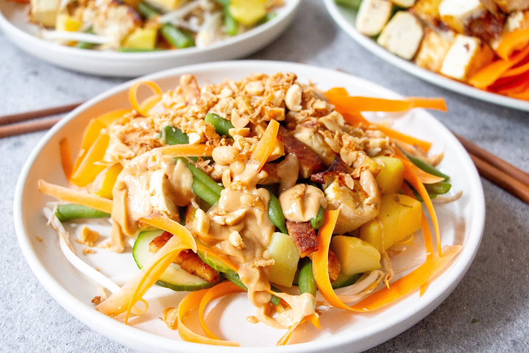 5. Alle vorbereiteten Zutaten – Kartoffeln, Bohnen, Karotten, Gurke, Sojasprossen, Tofu und Tempeh – auf einer großen Platte oder in einer Schüssel anrichten. Das warme Erdnuss-Dressing in einer separaten Schale dazu reichen oder direkt über den Salat geben. Nach Belieben mit gerösteten Erdnüssen und Röstzwiebeln garnieren.