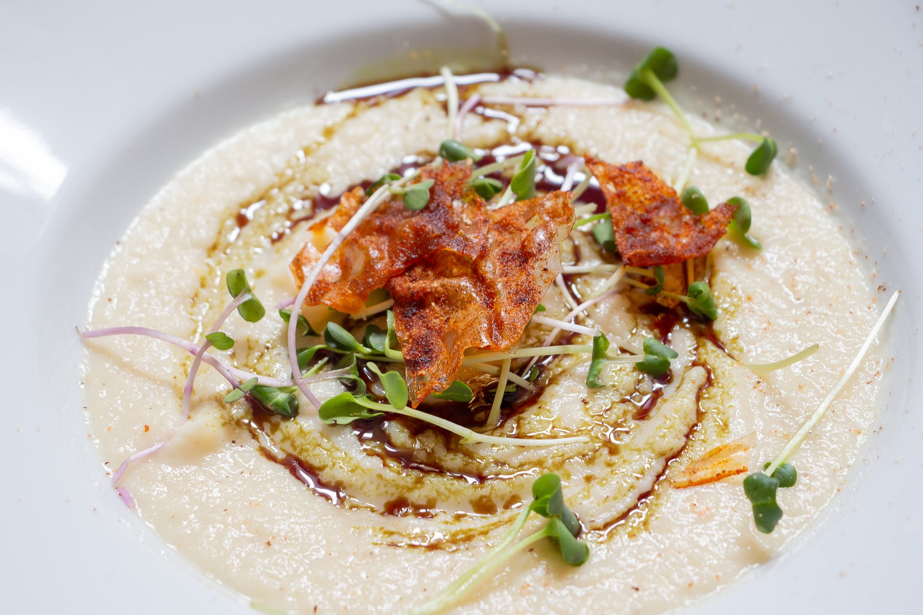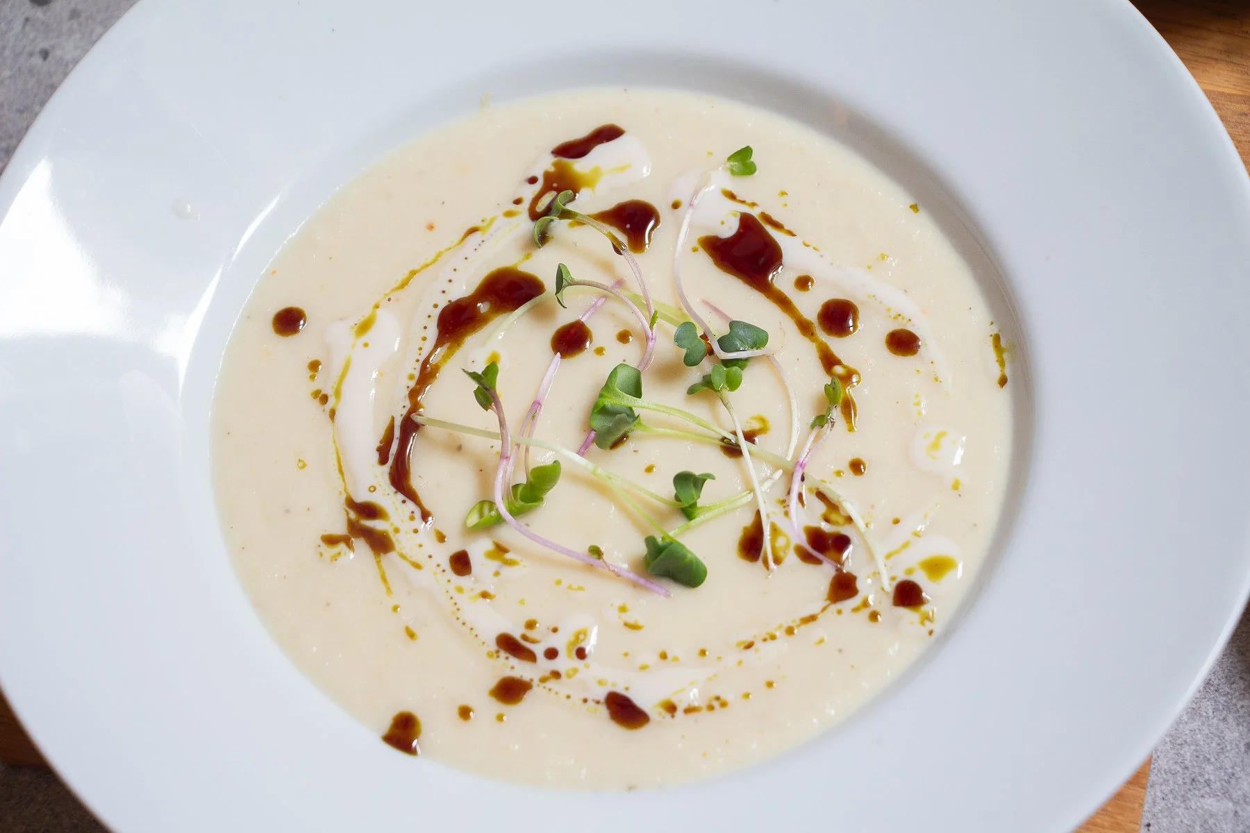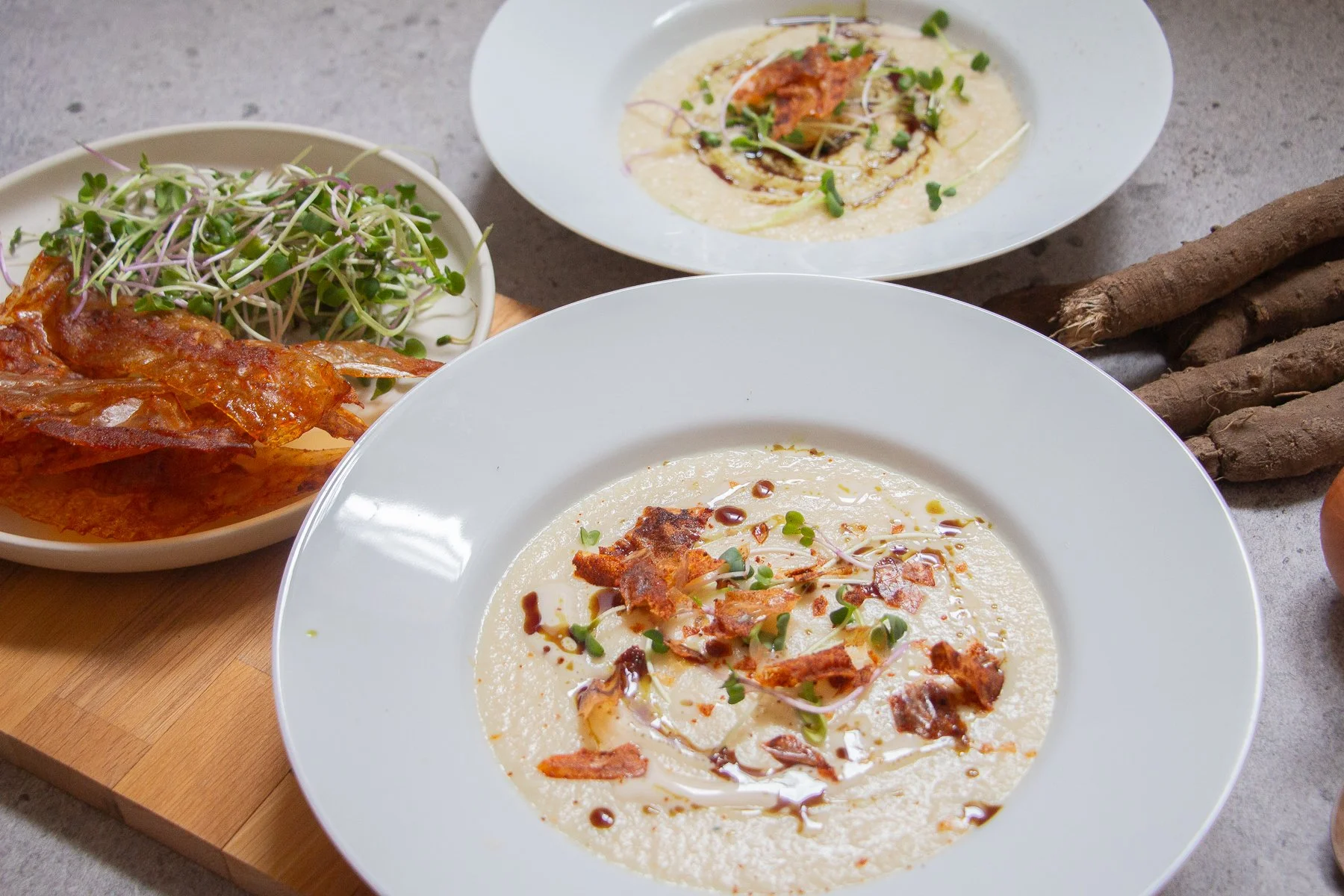 Das kräftig grüne Kürbiskernöl setzt als Topping einen intensiven farblichen Akzent und kommt in der weißen Suppe besonders schön zur Geltung kommt. Frische Kresse bringt zusätzlich eine leichte Schärfe und ein lebendiges Grün ins Spiel, während der knusprige vegane Reispapierbacon mit seinen rötlichen Tönen und dem rauchigen Aroma nicht nur geschmacklich, sondern auch farblich für Spannung sorgt.
