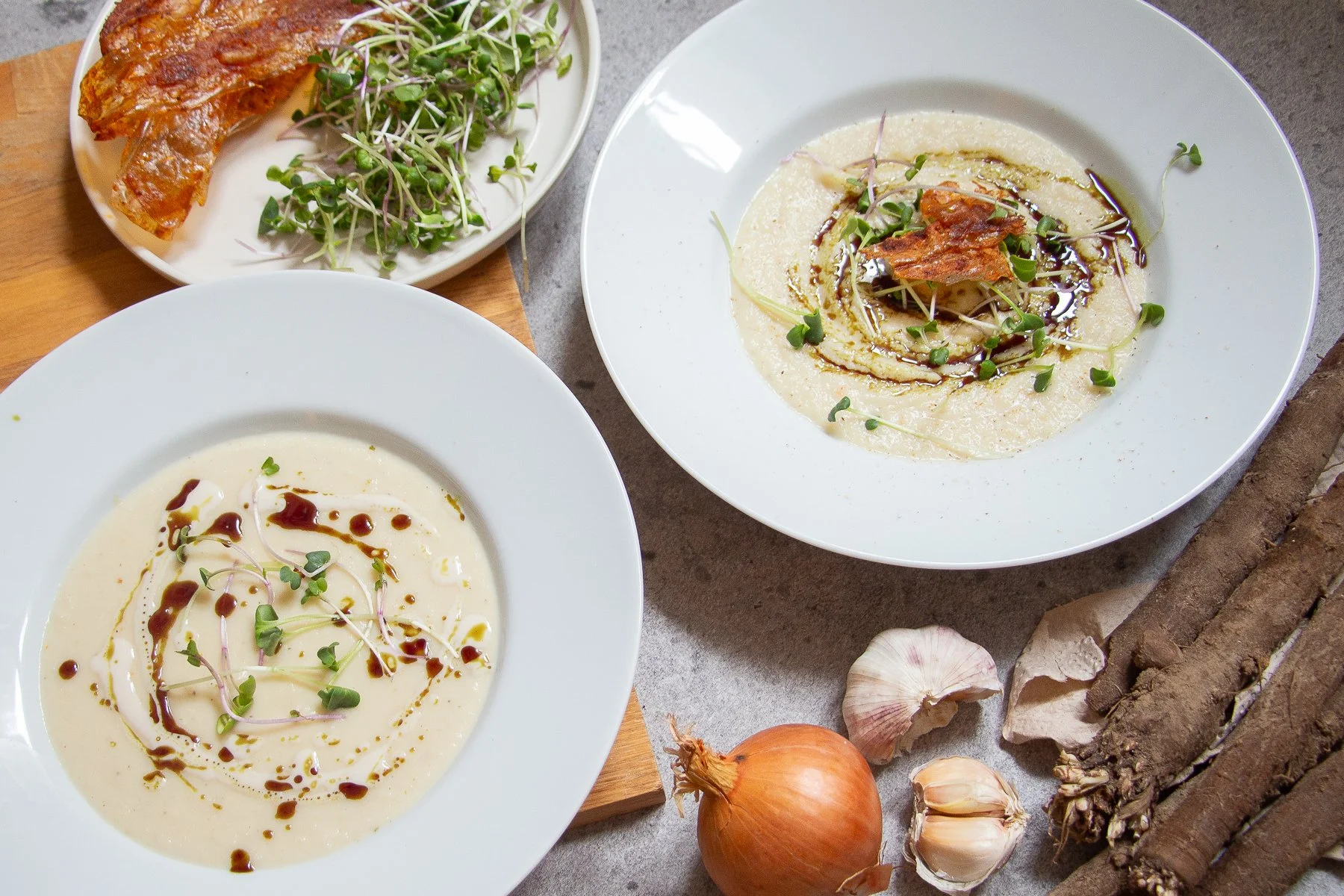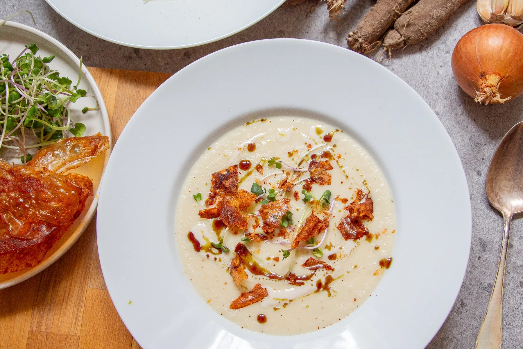 Beim Schälen zeigt die Schwarzwurzel ihren eigenwilligen Charakter: Der milchige Saft wird an der Luft schnell klebrig und kann sich orange verfärben. Doch die Mühe lohnt sich. Sanft angeschwitzt, mit Weißwein abgelöscht und in Gemüsebrühe sowie veganer Sahne cremig gekocht, entsteht eine wunderbar samtige Suppe mit feinem, elegantem Aroma. Und lässt man etwas Brühe weg, dient das Rezept auch als Pastasauce.