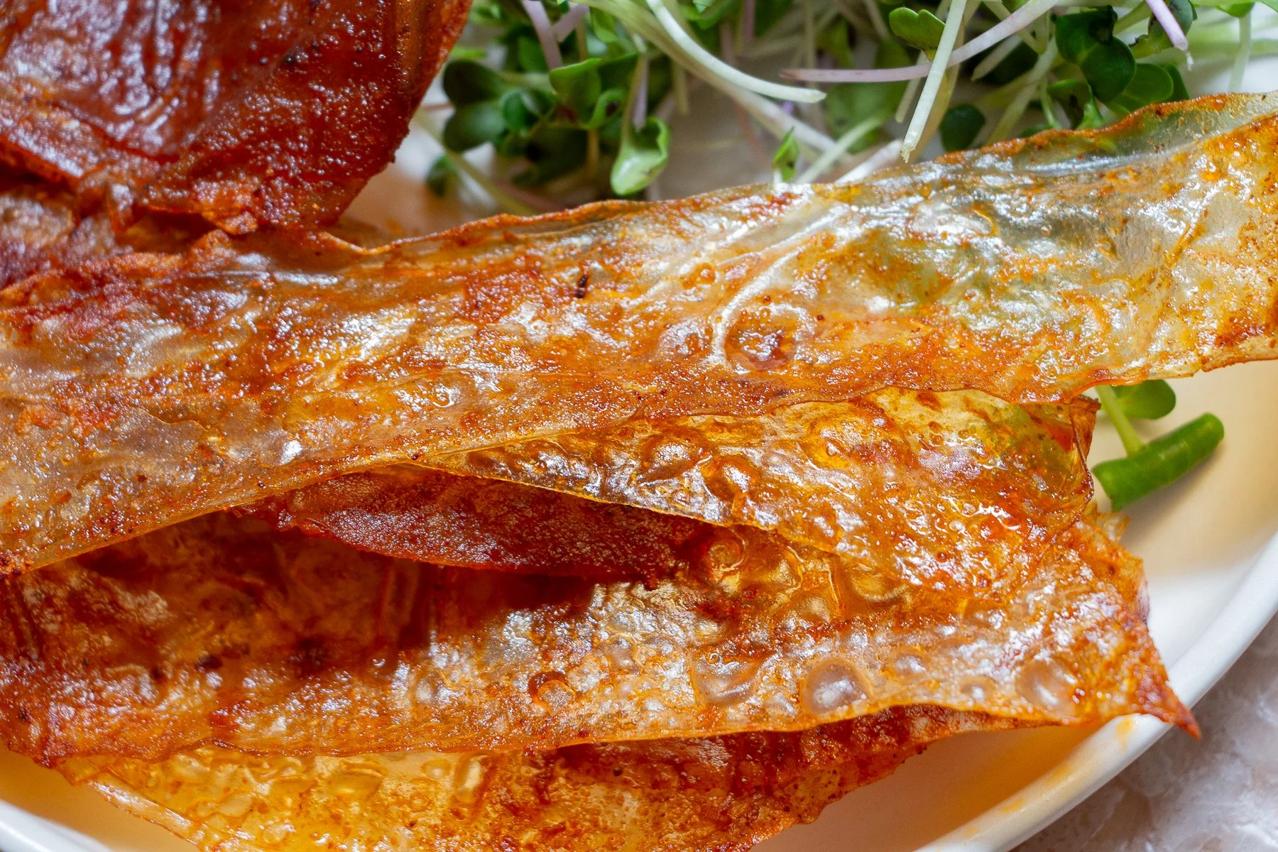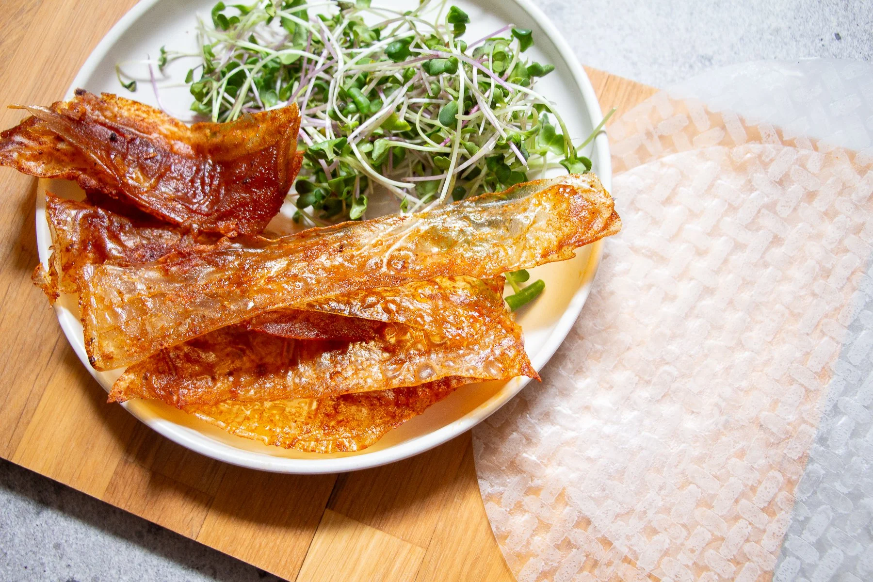 5. Die Zutaten der Marinade zusammenrühren und die Reispapierstreifen damit beidseitig bepinseln und diese auf ein Backblech legen. Das Blech für 8 Minuten in den Ofen. Dabei immer wieder beobachten, dass die Streifen knusprig werden (z.B. drehen, wenn notwendig).
