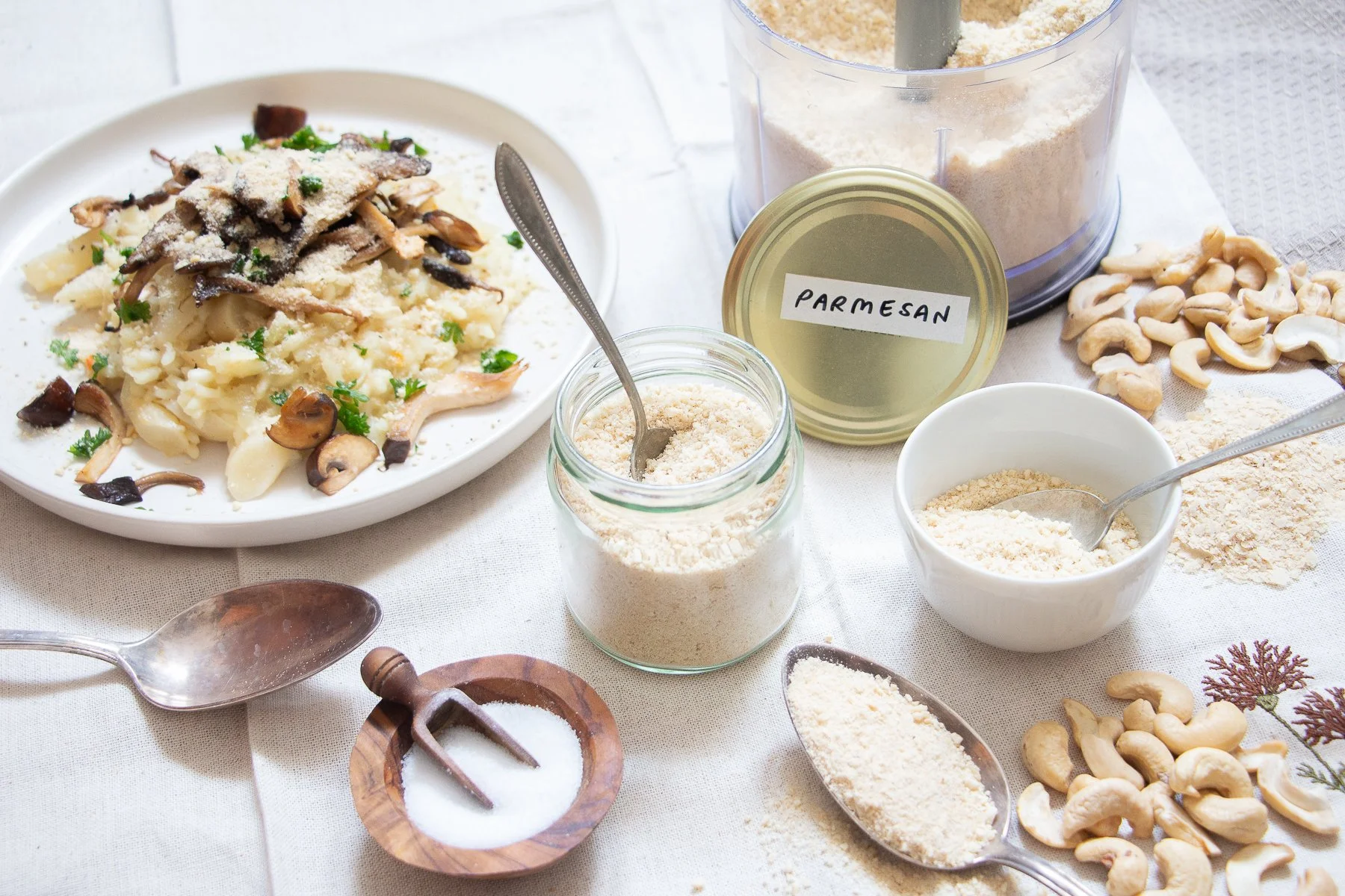 Der selbstgemachte Cashew-Parmesan ist ein praktischer Vorrat: lange haltbar und vielseitig einsetzbar – ob für Pasta, Salate oder Ofenkartoffeln. Cashews und Hefeflocken sorgen für eine würzige, käsige Note, letztere liefern zudem Vitamin B12.