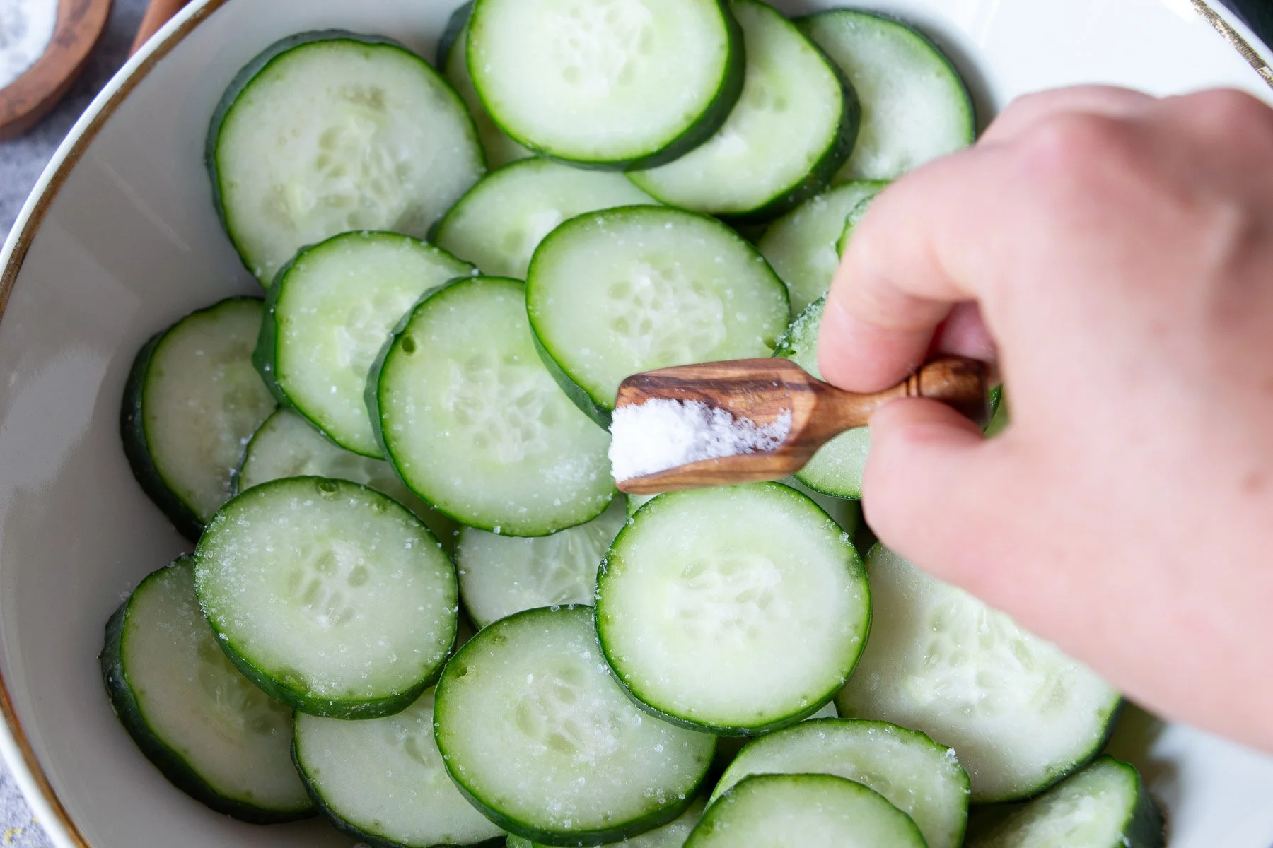 2. Salz über die Gurkenscheiben verteilen und 5 Minuten einziehen lassen.